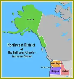 The Northwest District is one of the 35 districts of the Lutheran Church – Missouri Synod (LCMS), and encompasses the states of Alaska, Idaho, Oregon, and Washington; one Idaho congregation is in the Montana District. The Northwest District includes approximately 267 congregations and missions, subdivided into 25 circuits, as well as 93 preschools, 31 elementary schools and 4 high schools . Baptized membership in district congregations is approximately 65,461.[1]