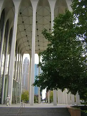 The building features an 85 foot (26 m) portico that serves as the visual terminus for the Nicollet Mall.[1] Yamasaki said that his design was intended to be "appropriate to an office building, monumental and dignified, yet graceful." The building is framed by about 63 slender quartz-faced concrete columns. He said the porch at the main entrance would be "delicate" and "a delight to walk through". Yamasaki's touches also included reflective pools and landscaping, and he claimed he was designing "a park with a building in it".[3]
