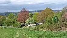 Norton parish boundary is of irregular footprint, but approximately, at its greatest distance, 2.5 miles (4 km) north to south, 2 miles (3 km) east to west in the northern half and 1 mile (2 km) east to west in the southern, and covers an area of 1,730 acres (700 hectares).[9] Adjacent parishes are Edvin Loach & Saltmarshe at the north-west, Tedstone Wafer and Tedstone Delamere at the north, Whitbourne at the north-east, Brockhampton at the east comprising the National Trust's Brockhampton Estate, Linton at the south, and Edwyn Ralph and Bromyard & Winslow at the west. The parish is rural, of farms, fields, managed woodland and coppices, water courses, small lakes and ponds, isolated and dispersed businesses, residential properties and, at the south-east, the public open land of Bromyard Downs where there is an agglomerated residential area. Flowing north to south at the west of the parish is a tributary to the River Frome which forms the western boundary with Bromyard & Winslow, and farther upstream, Edvin Loach & Saltmarshe. The confluence of the tributary and the Frome is at the extreme south-west of Norton which is conjoined with the town of Bromyard.[10][11][12][13]