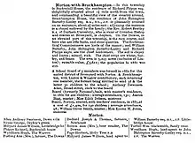During the 19th century, today's Norton was administratively a joint township with Brockhampton as 'Norton with Brockhampton', under Bromyard, which included in 1856 at the north-east of the parish, Saltmarshe Castle, the residence of Edmund Higginson (1802-71), who had changed his name from his Barneby birth surname, was High Sheriff of Herefordshire and an art collector, and whose estate also included parts of Tedstone Delamere and Edvin Loach parishes where he sponsored the rebuilding of the parish churches. Higginson was a chief landowner of the parish, and renovated Saltmarshe Castle to a more contemporary style of architecture, with added towers and battlements, leaving part of the old castle. Saltmarshe Castle was demolished in 1955. Also directory listed is Brockhampton House, 2 miles (3 km) north-east from Bromyard, had attached a private chapel with its own curate. Norton with Brockhampton had an infant school for boys and girls. The lord of the manor was the Bishop of Hereford, Renn Hampden. The parish of 1,708 acres (691 hectares) had 'clayey and loamy' soil, on which were grown chiefly wheat, barley and beans, and had an 1851 population of 528. Occupations listed in the Norton part of the parish were nine farmers, one of which was also a builder, a carrier—transporter of trade goods, with sometimes people, between different settlements—two shopkeepers, a miller at Three Mills, a blacksmith, and a collector of rates.[4][5]