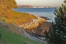 A 90-millimetre searchlight defence was situated at the bottom of the garden, overlooking Portland Harbour to illuminate surface targets. It would have been constructed between 1940–41, using concrete. The emplacement remained in the gardens throughout the 20th century, until it was destroyed by a landslip in 1988. However, by this point the Nothe Fort had become a tourist attraction, and members of the Weymouth Civic Society decided to rebuild a replica of the structure inside the grounds of the fort.[6][7][8] The replica was equipped with an original 90mm searchlight and associated equipment, and remains accessible to the public through entry to the fort.[9] It is situated on the northern side of the fort. Another searchlight emplacement, used as a sentry light to guard the entrance of Weymouth Harbour, is situated nearby at Weymouth's South Pier, and has become scheduled under the Ancient Monuments and Archaeological Areas Act 1979.[10]