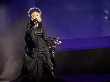 The song is performed as the opening number for Madonna's 2023-2024 Celebration Tour. During the performance, she wore a floor-length black kimono and a diamond radial headdress while a large white light shined above her.[86][87] The headdress was designed by German designer Malakai specifically for the tour, adorned with 25 large Swarovski crystals and paved with micro-crystals. It was designed with "Madonna's iconography and what she stands for" in mind.[88] Matt Cain from BBC Culture pointed out how "there are no distracting theatrics, just Madonna, her image and her voice – which has never sounded better" and described the performance as a "heartfelt rendition".[89] According to Liam Hess of Vogue, given that "Nothing Really Matters" is one of Madonna's most personal tracks, "it made for a neat introduction to a show that offered a deliberately looser, chattier glimpse at Madonna, the woman".[90]