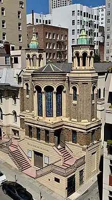 Église Notre Dame Des Victoires is a Catholic church in San Francisco, California. The church was founded in 1856 to serve the French Catholic immigrants during the Gold Rush.[2] The architectural model for the church is the Basilique Notre-Dame de Fourvière in Lyon, France.[3] In 1887, Pope Leo XIII signed the decree placing Eglise Notre Dame des Victoires under the charge of the Marists and giving it the designation of being a French National Church.