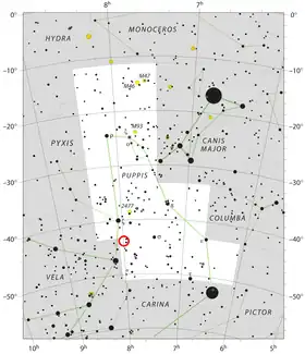 Nova Puppis 1673, also known as NSV 3846, is a probable nova in the constellation Puppis. It was discovered by Jean Richer on January 12, 1673 (and again observed on January 21) during the last year of an expedition Richer made to Cayenne, French Guiana. Richer measured its position on the sky using a mural quadrant, resulting in the most precise position available for a seventeenth-century nova that might be rediscovered by modern observers. At the time of its discovery the nova had a visual magnitude of 3, making it easily visible to the naked eye.[3][4][5]