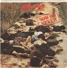 "Now or Never" is a political song.[3][4][5] According to John Lennon's biographer Peter Doggett, the lyrics of "Now or Never" sum up Ono's philosophy that "Dream you dream alone is just a dream/But dream we dream together is reality."[6] Cash Box described it as having "a delicate social commentary with an extremely important message that should be heard by all."[7] Record World said that Ono is "more melodically and lyrically sound" than on previous songs and that this song has an "important message, so listen."[8] New York Times music critic Stephen Holden described this line as expressing a "Beatles-style utopianism."[9] A Yoko Ono press release described the song as a "wistful wake-up call to a tuned-out, slacked-off America."[1] Vietnam War historian Lee Andresen considered the song to be a protest against the war.[10] The notorious cover of the single release, which depicted dead Vietnamese victims of the My Lai Massacre reinforced the Vietnam connection.[10] Andresen describes the cover as being "the most painfully graphic of any produced by record companies during the war."[10] Ben Urish and Ken Bielen describe the lyrics as being "interrogative."[11] Rolling Stone reviewer Nick Tosches was underwhelmed by the lyrics, using lines such as "People of America/When will we stop/It is now or never" as examples of the "obnoxiousness" of Ono's lyrics at the time, describing them as "philosophical and political party-line corn that went out of style with last season's prime-time TV."[12]