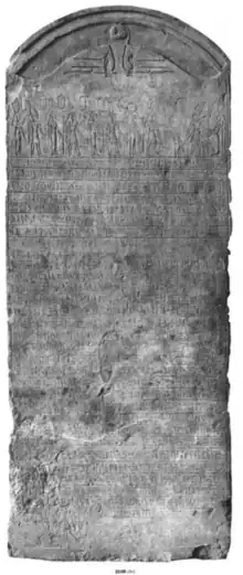 The limestone stele is rounded at the top, is 4 feet 2 inches (1.27 m) high, and 1 foot 8 inches (0.51 m) wide.'[1] The Nubayrah Stele is named for the present day town of Noubarya-(?) on the former Canopic branch of the Nile River; the town is southwest of Damanhur. The original "Nubayrah" was close to Damanhur.[2]