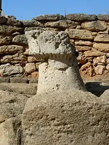 It was also built the meeting hut, equipped with a stone seat that runs along the perimeter, interrupted by a tank made of stone slabs, of unknown function, and a round stone seat for the chief, standing next to a niche in the wall. At the center of the hut, on a circular altar, it is present a model of a nuragic tower in sandstone. In this period were also built other huts in the village of higher dimension.[2]