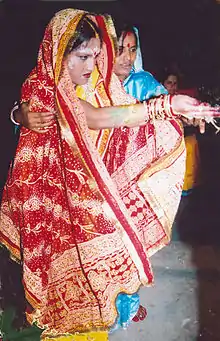 The bride receives sarees and jewellery from the bridegroom. Sankha (conch shell) is blown along with a specific sound called huḷu-huḷi by placing the tongue on the roof of the mouth with repeated opening and closing of mouth.[4]