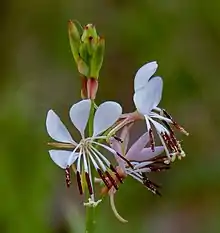 Roadside gaura flowers from April to June. Each plant produces a spike of closely packed flowers; several flowers open each day, around sunset. The flowers are relatively scentless. The flower has four long, white petals, each petal 10–15 mm (0.4–0.6 in) long and narrowed at the base. The fruit is a woody, indehiscent capsule with broad wings on the angles.[5][4]