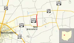 State Route 533 (SR 533) was a short two-lane north–south state highway in west central Ohio. Existing entirely within Jefferson Township, Logan County, and to the northeast of the county seat of Bellefontaine, SR 533 ran a distance of 1.8 miles (2.9 km) between SR 540 and SR 47 near the campus of Benjamin Logan Local School District. The entire route was turned over by the Ohio Department of Transportation (ODOT) to Logan County jurisdiction by 2014.