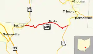 State Route 685 (SR 685) is a short east–west state highway in southeastern Ohio, a U.S. state. The western terminus of SR 685 is at SR 78 in the village of Buchtel. Its eastern terminus is at SR 13 approximately one mile (1.6 km) southwest of Jacksonville.