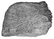 Langlands discovered five cup and ring marked stones on the east top of Bewick Hill in the 1820s; these are amongst the earliest to be documented in Britain, notably in George Tate's 1865 The Ancient British Sculptured Rocks of Northumberland.[15] Upon the discovery in 1852 of similar stones near Roughting Linn, near Doddington, Tate took it on himself to investigate the occurrence of these 'singular and mysterious inscriptions', using the platform of his presidency of the Berwickshire Naturalists Club to promulgate interest in the subject.[16]