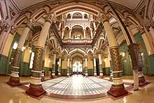 While the overall composition of the building is generally symmetrical, the 195-foot (59 m) clock tower on the left side of the principal facade gives an impression of asymmetry. The four main levels are executed in gray granite. The interior centers around a large skylit atrium surrounded by four levels of cloister-like arcades, linked by a grand staircase. The building housed city offices and courts.[4] Granite was locally obtained from quarries along the James River near Petersburg, and was shaped by workers under the direction of subcontractor James Netherwood. Iron work was by Asa Snyder.[5]