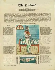Poet Henrik Wergeland wrote two songs about Høiland, the first "Ny Vise om Ole Pedersen Høilands sidste mærkelige Undvigelse fra Agerhuus Fæstning Natten til den 17de September 1839", and another song after his final arrest in 1842. His fellow prisoner Gjest Baardsen wrote a memorial song after Høiland's death, titled "Ole Høilands død". A biography of Høiland was printed in Christiania-Posten in 1849, and Jacob Breda Bull wrote about him in 1910. His life was basis for the film Ballad of the Masterthief Ole Hoiland from 1970, directed by Knut Andersen, where Per Jansen played the title character.[1][3]