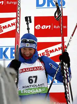 Olga Alekseyevna Zaitseva (Russian: Ольга Алексеевна Зайцева; born 16 May 1978) is a former Russian biathlete. She began her career in 1994. After not competing in the 2014–15 season, Zaitseva announced her retirement on 24 January 2015.[2] Shortly afterwards she announced that she had been appointed as caretaker head coach of the Russian biathlon team.[3]
