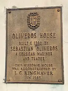 Oliveros was a sailor and native of Corsica who came to St. Augustine in 1733. According to documents of October 4, 1798, he "bought from the González Montes de Oca family their lot where he built a home for his family which consisted of a two-story coquina house." Oliveros married Catalina Usina, a local Minorcan girl, and rebuilt the house using coquina.[3] Oliveros frequently sailed to Charleston and northern ports within the United States. He was a victim of piracy in 1804 and was lost at sea.