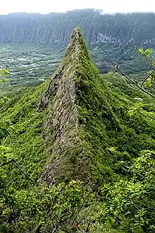 Olomana is a set of three mountainous peaks on the windward side of Oahu near Kailua and Waimanalo. While historically only the first peak was called Olomana and the second and third Paku'i and Ahiki (the least pointed peak) respectively, most people call the entire section Olomana.[1] Geologically speaking, Olomana is an erosional remnant from within the caldera of the Koʻolau Volcano.