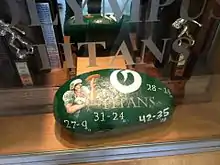 Considered one of the greatest rivalries in the state of Utah,[3] "the Rock" is the prized rivalry trophy between Olympus and Skyline football. It is a football-shaped piece of granite, which local lore states was taken from Mt. Olympus in 1962, prior to the first contest between the two schools. The winning school paints the Rock in their colors and displays it in their trophy case. Skyline maintains the edge, 26–23–1, but Olympus has won the Rock 7 years in a row. The two programs will have their 51st regular-season meeting in 2017.