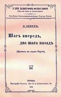 One Step Forward, Two Steps Back: The Crisis in Our Party (Russian: Шаг вперёд, два шага назад (Кризис в нашей партии), romanized: Shag vperyod, dva shaga nazad (Krizis v nashey partii)) is a work written by Vladimir Lenin and published on May 6/19, 1904. In it Lenin defends his role in the 2nd Congress of the Russian Social Democratic Labour Party, held in Brussels and London from July 30 to August 23, 1903. Lenin examines the circumstances that resulted in a split within the party between a Bolshevik ("majority") faction, led by himself, and a Menshevik ("minority") faction, led by Julius Martov.[1]