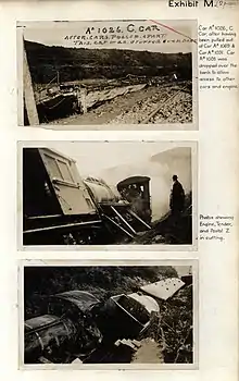 The three-man board of inquiry released its report on 30 August 1923. The inquiry heard evidence from 51 witnesses and found that there were good grounds for concluding that the slip was falling as the train approached, and that boulders obstructing the track were the cause of the disaster. No railway official was found guilty of neglect.[8]