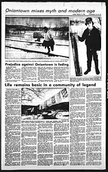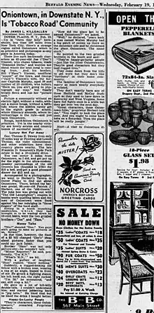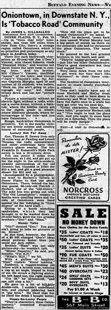 In 1947, International News Service reporter James L. Kilgallen voyaged into Oniontown and wrote three articles about the place including; “Escape from Atomic Age: Real Life Tobacco Road 100 Miles from Broadway”.[4][5]