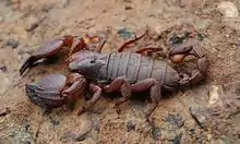 These muddy-looking scorpions are characterized by corrugations on the last sternite, stiff hairs (setae), and highly recurved tarsal claws. Males have corrugations on the last two sternites. They grow up to 70 mm in length.