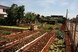 Organopónicos or organoponics is a system of urban agriculture using organic gardens. It originated in Cuba and is still mostly focused there. It often consists of low-level concrete walls filled with organic matter and soil, with lines of drip irrigation laid on the surface of the growing media. Organopónicos is a labour-intensive form of local agriculture.
