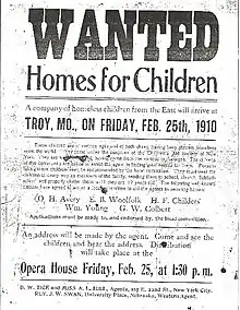 The first group of 45 children arrived in Dowagiac, Michigan, on October 1, 1854.[5] The children had traveled for days in uncomfortable conditions. They were accompanied by E. P. Smith of the Children's Aid Society.[5] Smith himself had let two different passengers on the riverboat from Manhattan adopt boys without checking their references.[9] Smith added a boy he met in the Albany railroad yard—a boy whose claim to orphanhood Smith never bothered to verify.[5] At a meeting in Dowagiac, Smith played on his audience's sympathy while pointing out that the boys were handy and the girls could be used for all types of housework.[5]