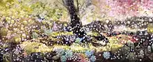 Oiwa also observes and depicts current day events and social issues in his artwork through his lens and experiences. His works encompass themes ranging from war and immigration, stemming from his family's history and immigration to globalization and nature and the environment. This are evident in works such as his Gardening series, colorful landscape paintings with multitudes of flowers floating above the cityscape with an underlying themes of nature, urbanization, and war in a layered narrative as well as many other. [] There is also a constant interest in the theme of light and dark, with Oiwa stating that “There would be no light without the dark.” [2] From using reoccurring images of clouds and smoke to dissolve light and dark in his pieces to using a variety of media including composition gold and silver leaf, glitter, and LED lights to both reflect and emit light, he plays with light while boldly making use of the colors produced as a result. In addition to his techniques surrounding the depiction of light in his works, he often also portrays this theme with the motif of the Shadow cat and Light Rabbit seen in several of his works.