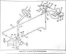 Turning was achieved with a hydraulically boosted mechanical link from the steering column to the forward drive assembly.[3] A similar dual-actuated system also applied the brakes, with an air-over-hydraulic setup. This allowed for a mechanical parking brake within the transmission.[3]