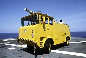 The MB-5 was originally built by American LaFrance.[1], starting in the early 1950s. This version of the truck (referred to in military manuals as the "Old model"[1]) had a few features that set it apart from the Oshkosh version. For one, many of these trucks had a static spotlight mounted directly above the cab, plus a flatter design with sliding doors as opposed to hinged doors that were present on the Oshkosh version. When the contract for American LaFrance's MB-5 ended, the navy selected Oshkosh Corporation to be the next designer. Design constraints stipulated that the vehicle was to function on aircraft carriers and shore stations, while also being similar in operation to its predecessor. The truck Oshkosh presented was unlike any other on the market to date, being the first fire truck equipped with pump and roll capabilities.[1] Although the MB-5 was designed for use on aircraft carriers, it had many features that made it an ideal fire truck for shore-based airports. It was quickly shipped all over the country, and the MB-5 became the most common fire truck in military airbases. They lasted for years, even receiving modifications until their retirement. Their removal from the military in the early 1980s was not the end of their life, however. Many civilian airports began buying them as surplus with some using the MB-5 until the early 1990s.