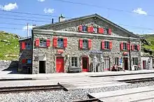 Ospizio Bernina railway station is a station on the Bernina line of the Rhaetian Railway. The station lies on the shores of Lago Bianco, near the Bernina Pass, between the Engadin and the valley of Poschiavo, in Graubünden. It is named after the hostel (historically, ospizio in Italian) that lies on the road pass, 50 metres above the station. Administratively, the area belongs to the municipality of Poschiavo.[1][4]