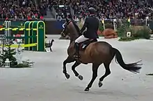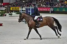 He competed at the famous CHIO Aachen on bar heights of 1.55 m in August 2015, completing a faultless first round, but finishing his second round with 8 points, giving him 6th place.[20] In September 2015, he jumped during the highly-regarded Spruce Meadows CSIO in Calgary, dropping a bar in each of the two 1.60 m events he took part in, which didn't prevent him from finishing 9th in the Akita Drilling Cup standings,[21] then 6th in the six-bar event.[22]
