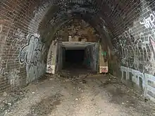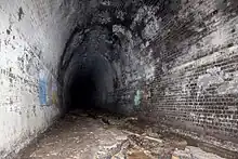 In 1942/43, as part of a war-time explosives programme, the Army detonated a section of roof approximately 1,630 to 1,643 m (5,348 to 5,390 ft) into the tunnel.[4]