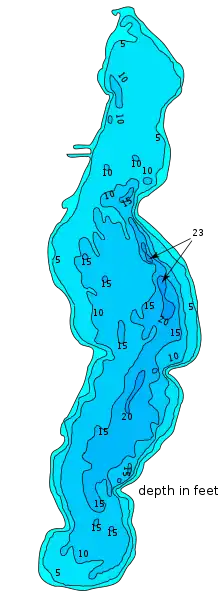 Otsego Lake is 1,972 acres (7.98 km2), and 5 miles (8.0 km) long and 1 mile (1.6 km) at its widest. In general, it is a shallow lake averaging about 6–8 feet in most places, with a maximum depth of approximately 23 feet (7.0 m) in a few spots. The bottom shoal composed of sand and light gravel forms many "drop-offs" and holes. The lake is full of vegetation which is submerged at the bottom of the lake with very little floating vegetation.[3]