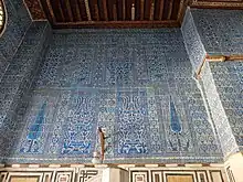 As the construction of new monumental funerary complexes declined in Cairo during the Ottoman period, local Ottomans were instead buried in older mausoleums from earlier periods.[24] A well known example is the 14th-century Aqsunqur Mosque (now also known as the "Blue Mosque"), which was renovated in 1652 by Ibrahim Agha, a local Janissary commander. The renovation added extensive Ottoman Iznik tile decoration on the qibla wall and in the attached tomb he built for himself.[25][26] Another example of a Mamluk building repurposed is the 14th-century Madrasa of Amir Sunqur Sa'di, which an Ottoman pasha gifted in 1607 to the Mevlevis, a Sufi order popular in the Ottoman Empire.[27] A Sufi ceremonial hall, still extant today, was later built over the remains of the madrasa's courtyard in the 19th century.[28]