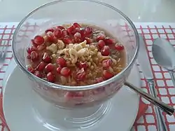 The wheat berry pudding aşure, in modern times a part of the Islamic holy day Ashura, has roots in the harvest rituals of the Neolithic period, since which time domesticated wheat is known to have been cultivated at Karaca Dağ.[16]