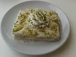 Stuffed roasted lamb with a filling of rice and raisins was served at a feast held in honor of Mahmud II's sons.[39] It was a choice offering at the garden parties of Istanbul's elites.[40] In 1719 stuffed lamb was served as a feast organized by the newly appointed governor of Mosul.[41] The 13th century Danishmendname describes whole stuffed lambs served at a wedding feast: Çevirme kuzıların dolmış içi.