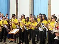 Nowadays, the celebration of the Palm Sunday, as well as the other celebrations, follow the rite promulgated by the Second Vatican Council, and begins at the windows of the Church of Our Lord of Bonfim. Upon arrival, the priest greets the people in the usual way, recites the prayers, and sprinkles the branches with holy water. The proclamation of the Gospel is made and then the procession is announced. At the beginning of the procession, immediately in front, goes the acolyte with the lighted thurible, and then, according to ancient local custom, the cruciferary, a Brother of the Blessed Sacrament with the ornamented cross; two Brothers leading the lanterns forming the wing of the faithful on the sides of the street in single line. In the center, the youth group of the Stations of the Cross Pastoral, followed by the guild of the Brotherhood of the Blessed Sacrament with the parish priest, accompanied by the Phoenix Band that performs the traditional dobrados and festive marches from its repertoire. When the priest arrives at the Mother Church, where the altar for the outdoor mass is located, he continues the celebration in the usual way, without the presence of the traditional choir and orchestra. On Palm Sunday evening and Holy Monday, the other celebrations of the Feast of the Steps take place.[42]