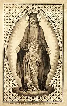 At the end of the 19th century, the devotion to Our Lady of the Sacred Heart spread throughout America and Europe. The iconography of was slightly changed in the way that Jesus appears as a child in his mother's arms, while Mary showed the heart of her son.[3]