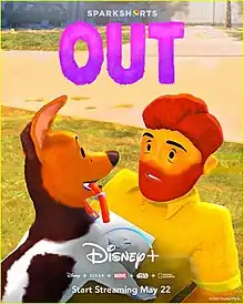 Out is a 2020 American computer-animated short film directed and written by Steven Hunter, produced by Max Sachar, and distributed by Pixar Animation Studios and Walt Disney Studios Motion Pictures.[1] The plot features a young gay man who has not yet come out to his parents, who unexpectedly has his mind magically swapped with his dog's. The seventh short film in the SparkShorts series, it is both Disney's and Pixar's first short to feature a gay main character and storyline, including an on-screen same-sex kiss.[2] The short was released on Disney+ on May 22, 2020.[3] The short was shortlisted for the Academy Award for Best Animated Short Film at the 93rd Academy Awards.[4]