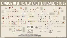 Baldwin negotiated a marriage between Hugh III, Duke of Burgundy, and Sibylla, but the succession crisis in France prevented him from sailing. Tension between Baldwin's maternal and paternal relatives grew. When Raymond and Bohemond, both related to him on his father's side, came to Jerusalem unexpectedly before Easter in 1180, Baldwin panicked, fearing they had arrived to depose him and elevate Sibylla to the throne under their control. To thwart their coup, he sanctioned her marriage to Guy of Lusignan, a young aristocrat from Poitou. Guy's brother Aimery held the office of constable of Jerusalem, and their family had close links to the House of Plantagenet. Baldwin's mother and her clique marginalised Raymond, Bohemond and the influential Ibelin family.[141][142] To prepare for a military campaign against the Seljuks of Rum, Saladin concluded a two-year truce with Baldwin and, after launching a short but devastating campaign along the coast of Tripoli, with Raymond. For the first time in the history of Frankish–Muslim relations, the Franks could not set conditions for the peace.[143][144] Between 1180 and 1183, Saladin asserted his suzerainty over the Artuqids, concluded a peace treaty with the Rum Seljuks, seized Aleppo from the Zengids and re-established the Egyptian navy. Meanwhile, after the truce expired in 1182, Saladin demonstrated the strategic advantage he had by holding both Cairo and Damascus. While he faced Baldwin in Oultrejordain, his troops from Syria pillaged Galilee.[112][145] The Franks adopted a defensive tactic and strengthened their fortresses. In February 1183, a Jerusalemite assembly levied an extraordinary tax for defence funding. Raynald was the sole Frankish ruler to pursue an offensive policy. He attacked an Egyptian caravan and built a fleet for a naval raid into the Red Sea.[146]