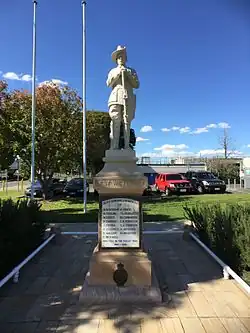 The sandstone and marble monument stands on a low dressed stone plinth surrounded by stone pavers. A stepped sandstone pedestal bears a sandstone soldier figure facing west. Identifiably Australian with a slouch hat and "rising sun" hat badge, the little digger stands at ease with hands resting on his rifle in the reversed arms position.[1]