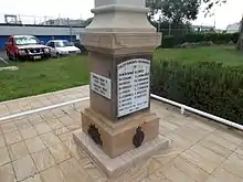 The west face of the dado bears a marble plaque commemorating those associated with of the district who fell in the First World War. It reads:[1]
