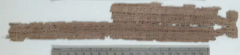 The Oxyrhynchus hymn (or P. Oxy. XV 1786) is the earliest known manuscript of a Christian Greek hymn to contain both lyrics and musical notation. The papyrus on which the hymn was written dates from around the end of the 3rd century AD.[1] It is on Papyrus 1786 of the Oxyrhynchus papyri, now kept at the Papyrology Rooms of the Sackler Library, Oxford. The manuscript was discovered in 1918 in Oxyrhynchus, Egypt, and later published in 1922.[2]