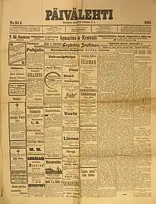 Päivälehti was a newspaper in Finland, which was then a Grand Duchy under the Czar of Russia. The paper was founded in 1889[1] as the organ of the Young Finnish Party and was published on six days a week. The founding company of the paper was Sanoma which also started its activities in the same year.[1] The founder of the paper was the Finnish journalist Eero Erkko who also served as its editor-in-chief.[1]