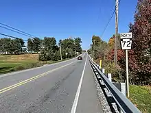 When Pennsylvania first legislated routes following the passage of the Sproul Road Bill in 1911, Legislative Route 138 was designated between Lancaster and Cornwall while a portion of Legislative Route 137 was designated between Cornwall and Lebanon. A portion of Legislative Route 141 was designated from Lebanon north to Lickdale; the route bended to the west between Jonestown and Lickdale. The portion of road between Lickdale and Green Point became a part of Legislative Route 140.[7] With the creation of the U.S. Highway System in 1926, the road heading south from Lancaster was designated as part of US 230.[8] PA 72 was designated in 1927 to run from the Maryland state line north to Lancaster, running concurrent with US 230.[8][9] In 1928, PA 72 was extended north from Lancaster to PA 343 north of Jonestown; also, US 222 replaced the US 230 designation that was concurrent with the route between the Maryland state line and Lancaster. PA 72 followed US 222 from the Maryland state line north through Quarryville to Lancaster, where it continued north along its current alignment to Quentin. Here, it turned east along PA 5 (later US 322, now PA 419) to Cornwall and then north along Cornwall Road to Lebanon. PA 72 continued through Lebanon and headed north, passing through Jonestown along Lancaster Street and continuing north to PA 343 at Mowery Road.[10][11] By 1930, the southern terminus of PA 72 was cut back to US 230 at the intersection of Prince Street and Harrisburg Avenue in Lancaster, eliminating the concurrency with US 222 south of Lancaster.[11][12] At this time, all of PA 72 was paved except for the portion north of Jonestown.[11]
