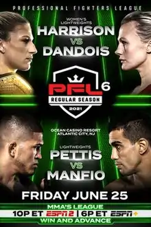 The PFL 6 mixed martial arts event for the 2021 season of the Professional Fighters League was held on June 25, 2021. This was the third regular season event of the tournament and included fights in the Heavyweight and women's Lightweight divisions. This event will aire on ESPN2, with the prelims on ESPN+.[1][2]