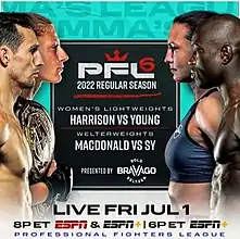 - ↑ "PFL 2022, Week 6 weigh-in results: Kayla Harrison, Rory MacDonald official; Dilano Taylor steps in late". MMA Junkie. 2022-06-30. Retrieved 2022-07-01.