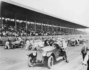 Three major races were held on the brand new track in 1915, the most important of which was the 250-mile (400 km) Montamarathon Classic on July 4, won by Glover Ruckstell driving a Mercer.[7] That day also saw the track's first racer fatalities (spectators had been killed in 1912 and 1914[4][8]), when a car carrying Billy Carlson and his riding mechanic left the track after incurring a punctured tire.[9] Carlson was one of several drivers who had urged the track be paved with creosoted wood blocks instead of split boards, for safety reasons.[10] One other driver died at the track in 1917, also due to a puncture.[4]